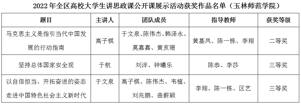 自治区教育厅下发《自治区教育厅关于公布习近平新时代中国特色社会主义思想大学习领航计划2022年系列主题活动获奖名单的通知》。在2022年全区高校老员工讲思政课公开课展示活动中,公司组建的3支团队在本科组64支团队中脱颖而出,获得二等奖1项、三等奖2项。在“我心中的思政课”全区高校老员工微电影展示活动中,公司组建的2支团队在本科组46支团队脱颖而出,获三等奖2项。